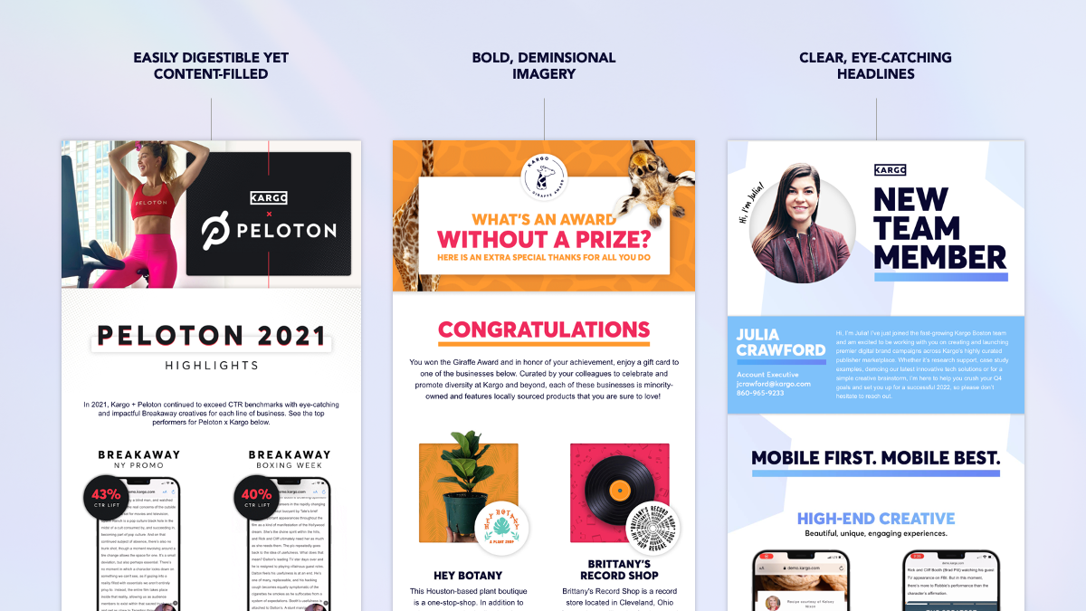 From April to July of 2020 I worked with two other designers to refine the Kargo brand. The goal of this mission was to redefine a cohesive visual identity across sales and marketing communications, as well as optimize our workflows.