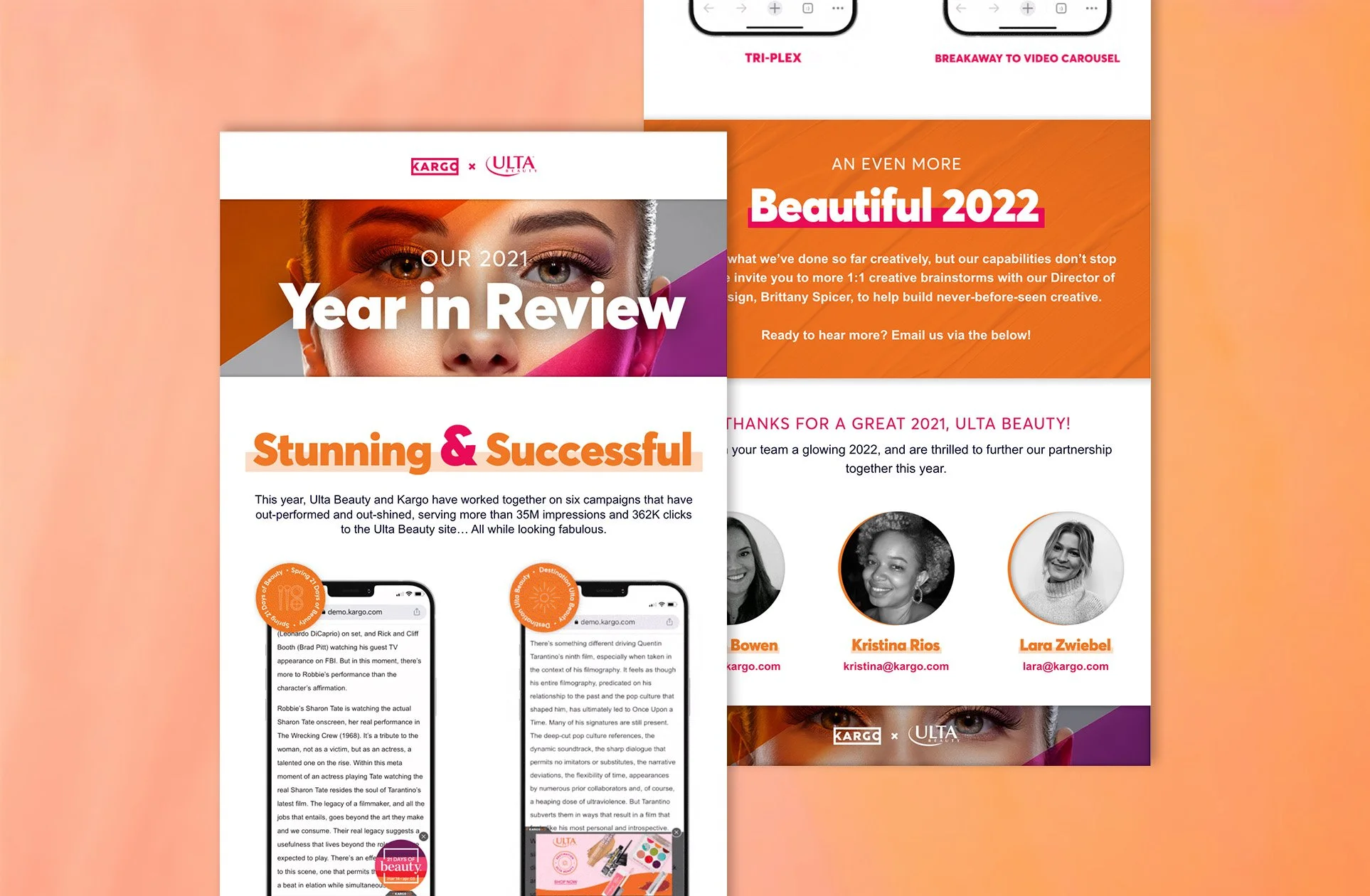 An example of the personalized quarterly newsletter's I create for Kargo vast assortment of clients. This one recaps Kargo + Ulta’s recent work, and acted as a thought-starter for 2022.